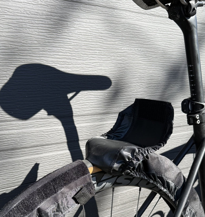 Made with tough 600-denier polyester in the center and nylon sides with snug elastic edges, they fit perfectly around your tires and let your wheels roll freely. Move your bike around, no lifting needed. Easy on, easy off, made to last — and now available in multiple sizes to fit mountain bikes, gravel and road bikes.